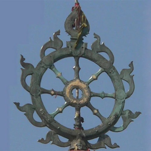 A massive wheel atop the temple made of a single piece of ashtadhatu (eight metals).